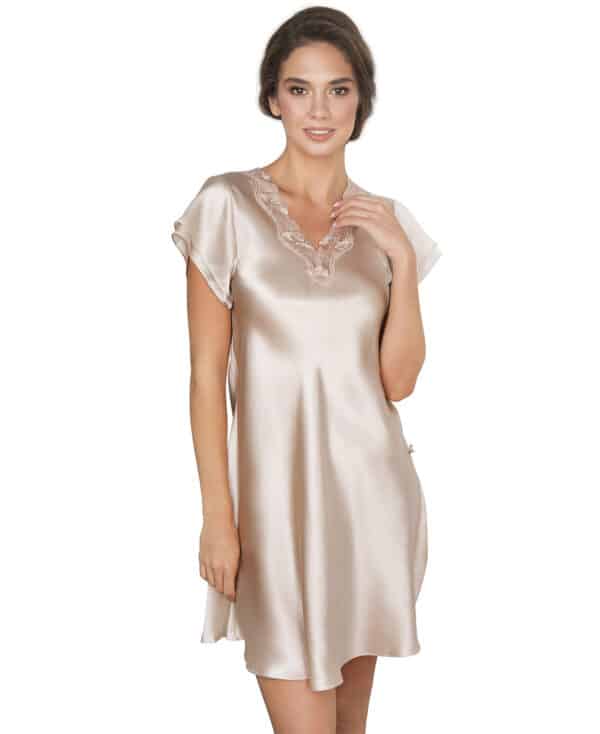 Lace-natkjole med korte ærmer i 100 % vævet silke. En meget elegant natkjole med afrundet, Løs bund. Håndvask